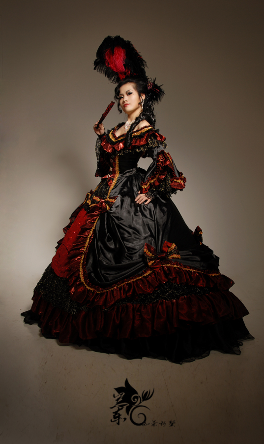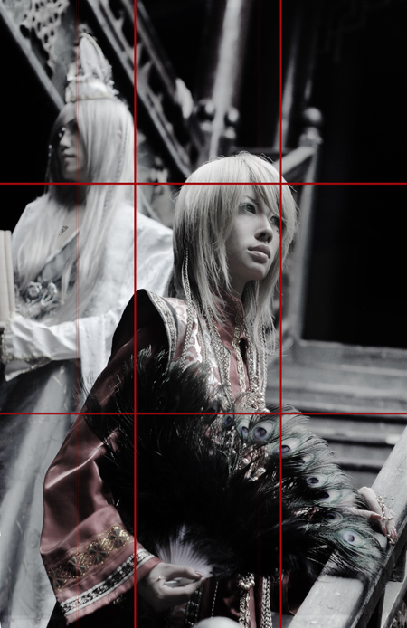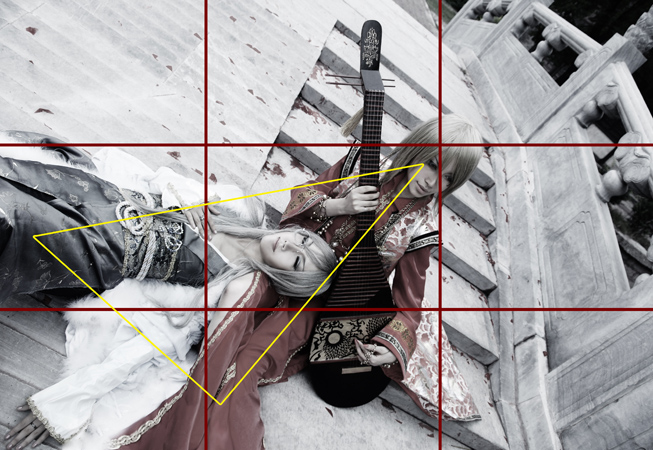 那么仔细分析一下,拍摄时摄影师取了比较夸张的大俯角,规避了凌乱的树叶,画面背景为大面积的青蓝色石板;人物则置于三分法则的交点上,形成了稳定的三角形结构。以单色构成画面的下侧,使观赏者的视线集中到人物上。石桥的青蓝色系奠定了画面的整体基调,显得典雅而古朴,近似时尚片。而点缀其间的红色花瓣和COSER艳丽的服饰则从这片冷色中脱颖而出,起到了强烈的视觉冲击效果。加之COSER间的表情与动态,赋予了这张图强烈的动感与剧情感。